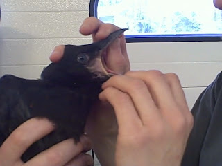 The young raven, above, has the blue eyes of a juvenile. Watch a video of his exam!