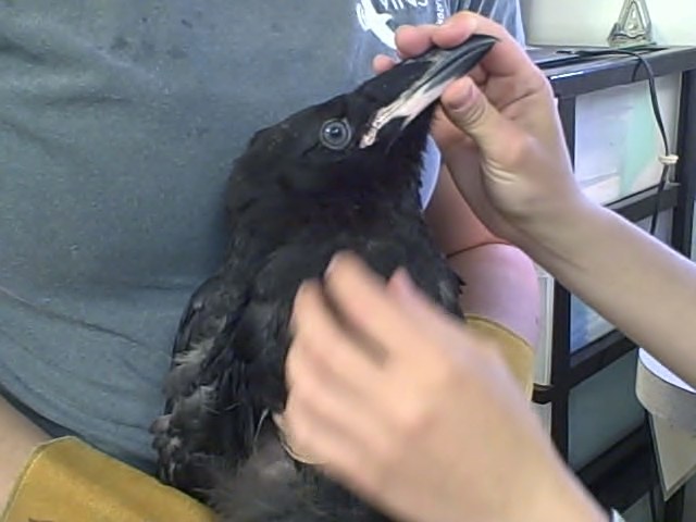 Above, a juvenile crow’s mouth is examined. Watch his full exam and learn more about this crow!