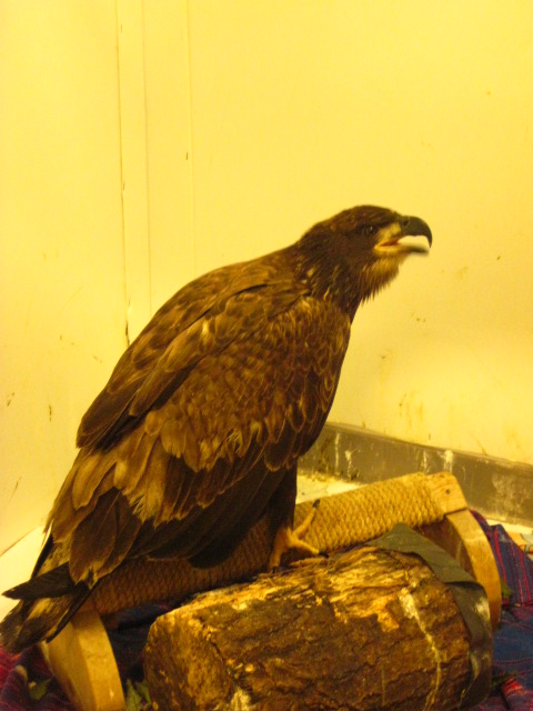 We immediately wrapped the eagle’s wing to allow his fracture to heal properly. The wrap was removed after 2 weeks’ time, and we found the wing to have healed nicely. The fracture — though healed — is still a bit fragile, so for now the eagle, which we believe to be male based on his size, is indoors in a smaller enclosure. Eventually he will be moved into our outdoor flight cage, where we can monitor his flight and see if his injuries have altered his flight ability. The eagle is eating heaping portions of fish and other meat daily. He is feisty, alert and bright-eyed — all promising signs for a return to the wild.