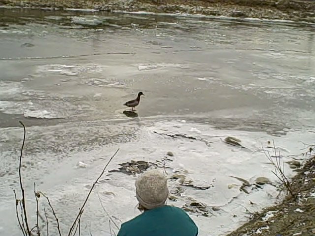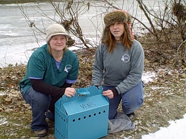 Above, VINS intern Katie Christman watches as the duck makes his way across the ice. Below, Katie (left) and intern Hannah Goldman prepare to release the duck. Below that, an up-close shot of the mallard.
