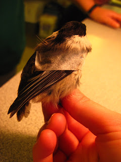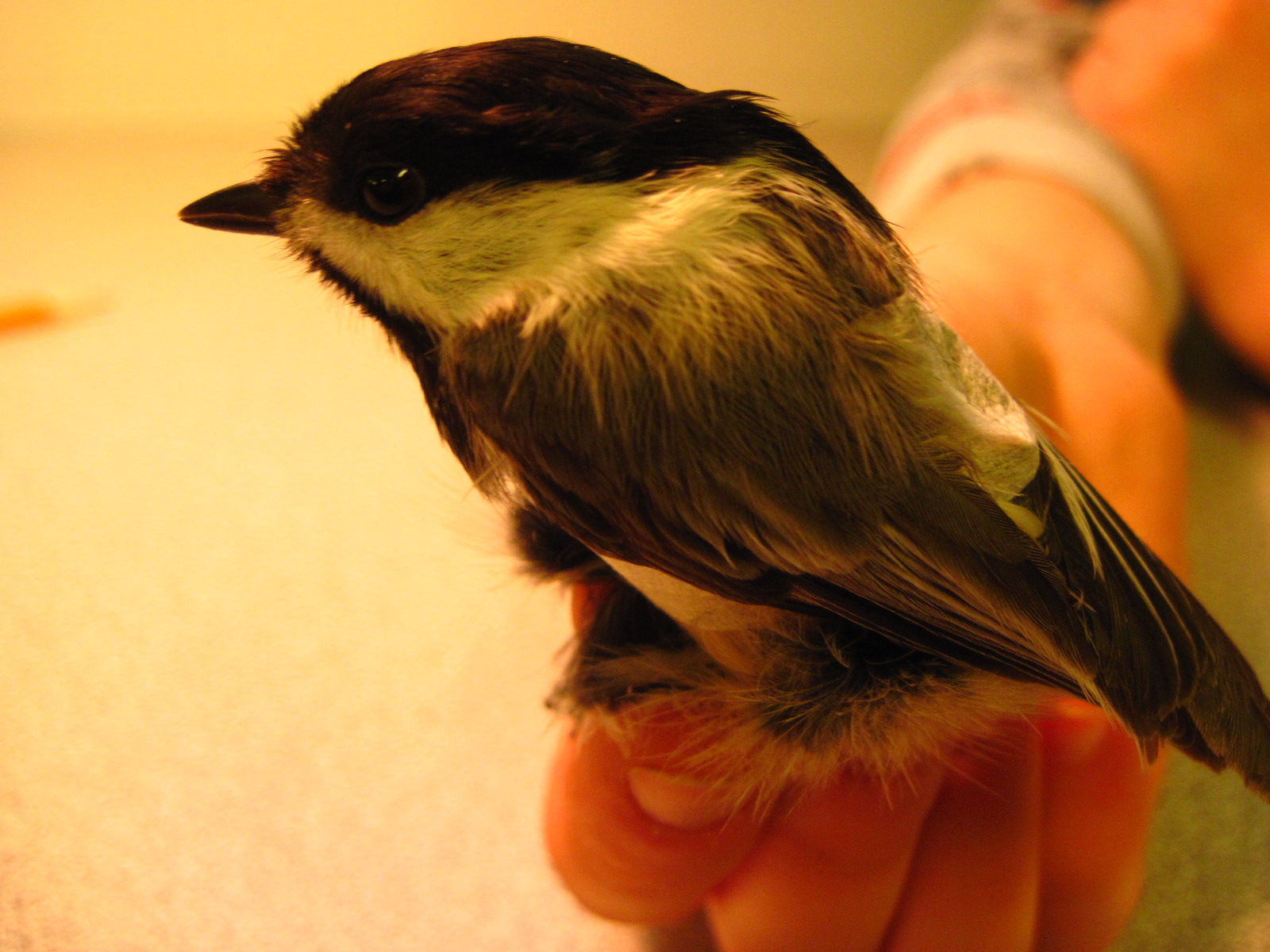 The chickadee also suffered a fracture in his right wing, and — from the sounds of his gurgled breathing — some internal trauma. We’ve wrapped the wing so that the fracture can heal, and put this little fellow on antibiotics to treat the cat bite wounds. Cats have a bacteria in their saliva that is toxic to birds, so it is essential we administer antibiotics. In due time, his tail feathers will grow back, and he’ll be as good as new.