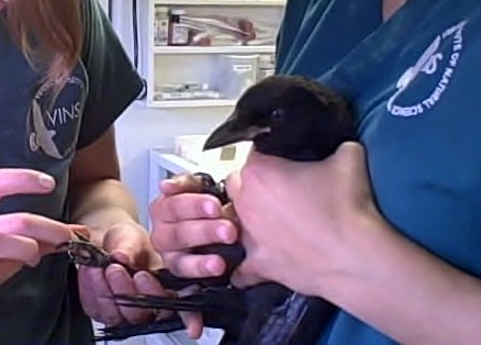 This young American crow first came to VINS on May 28th, 2011. He had become tangled in a fence and his leg was snapped, right between what is equivalent to our knee and ankle. He happens to be a very popular little bird, too. Not only did three humans work together to remove him from the fence, but his whole family group (called a ‘murder’) dive-bombed the rescuers in an attempt to protect the little guy.