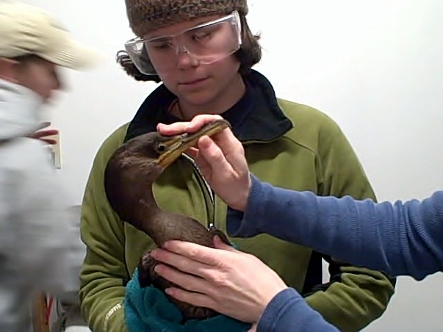 Tubing this guy can be challenging. He’s got a long, wiggly neck that writhes around when we try to place a tube into it, so we often find it takes three people to get the job done: one to hold the bird, another to hold open the beak and control the neck, and a third to do the actual tubing. Watch staff tube-feed the cormorant in our video.