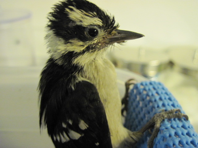 We recently received a fledgling downy woodpecker — about 4 weeks old — into our care. The young DOWO (abbreviation for downy woodpecker) was struck by a car, and presented with head trauma.