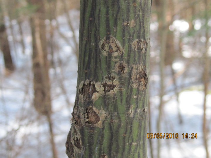 Photos clockwise from top left: a tape measure next to a dog track; pine cone chewings from a red squirrel; and tooth marks from a red squirrel biting into a striped maple to drink sap.