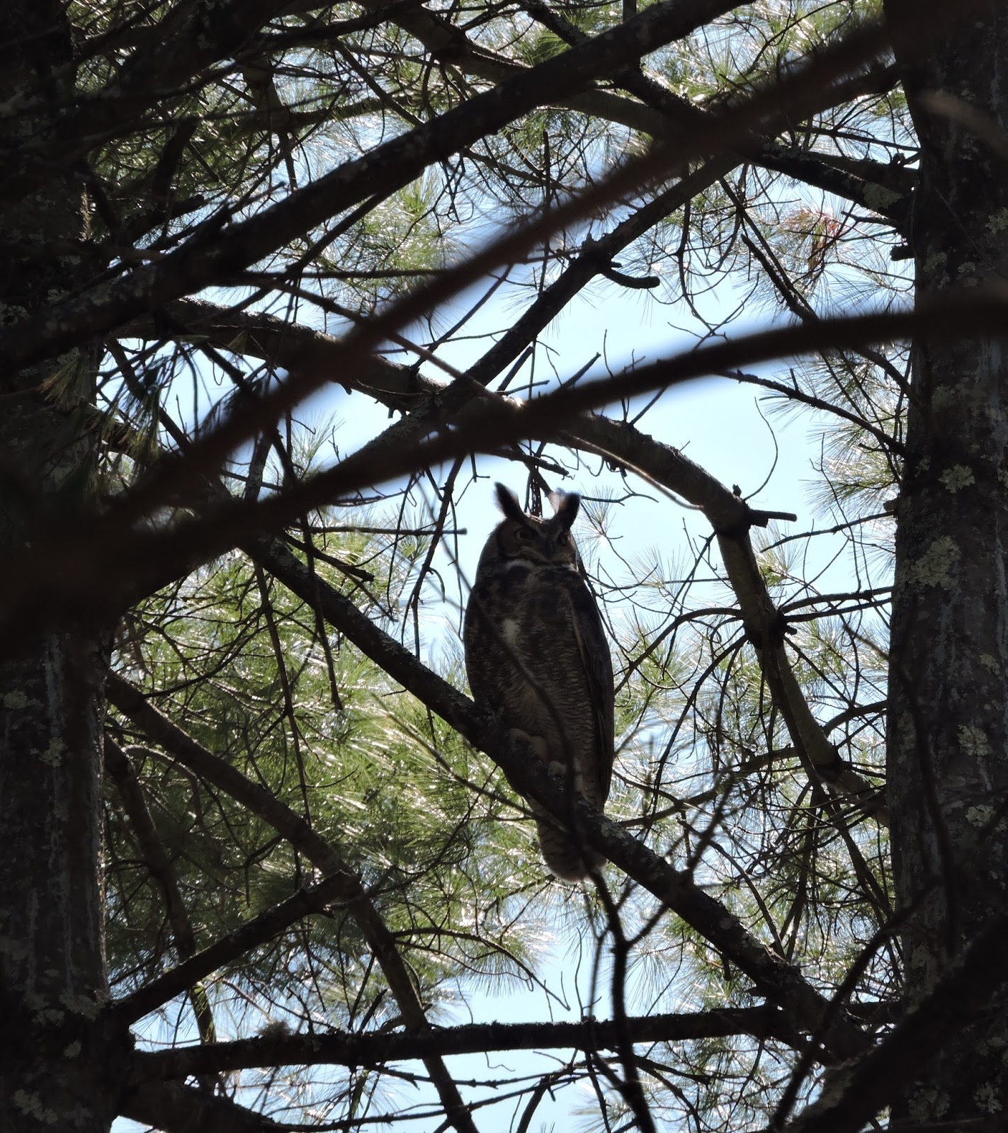 The rest of us turned to follow her gaze, and caught only a glimpse of the silhouette of an adult Great Horned Owl flying away into the forest. It made no sound as it went.