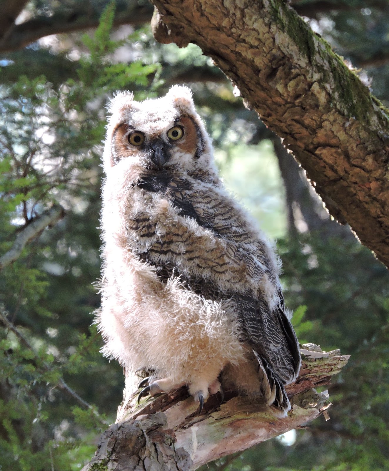 Right in front of us, staring back in our direction, was another fluffy, baby Great Horned Owl perched about 10 feet up on a tall snag. His body was facing away but his long, flexible owl neck was curved toward us, and his tiny ear tufts stood tall.