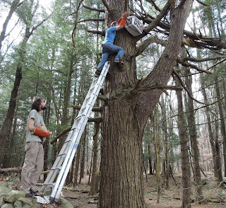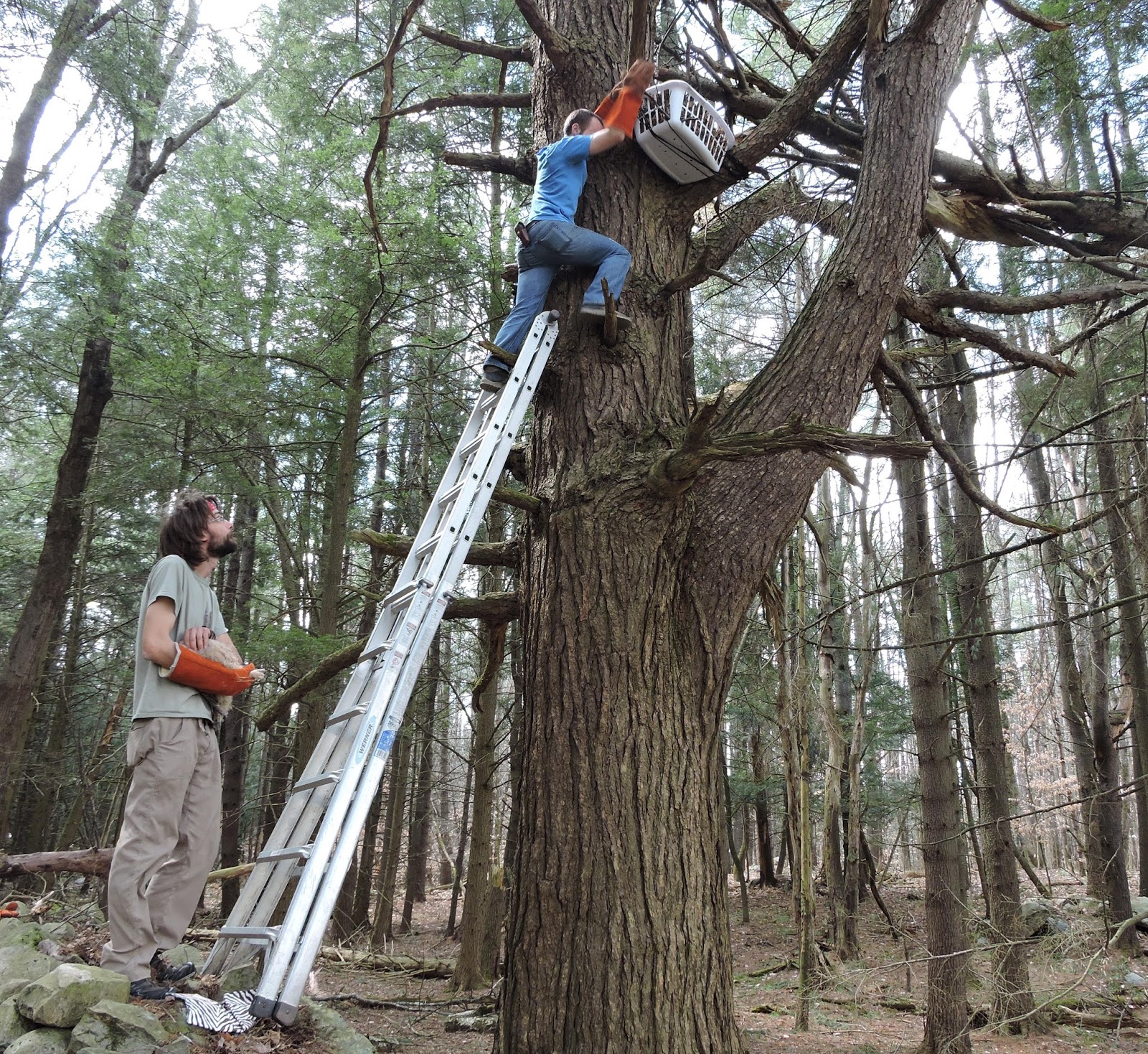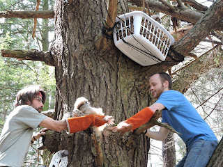 With Dick’s help (it turns out he used to be a roofer!) we easily finagled the ladder back into place atop the stone wall and against the big pine tree. Peter climbed up to the nest, and we ferried the owlets up to him so he could place them gently into their new home.