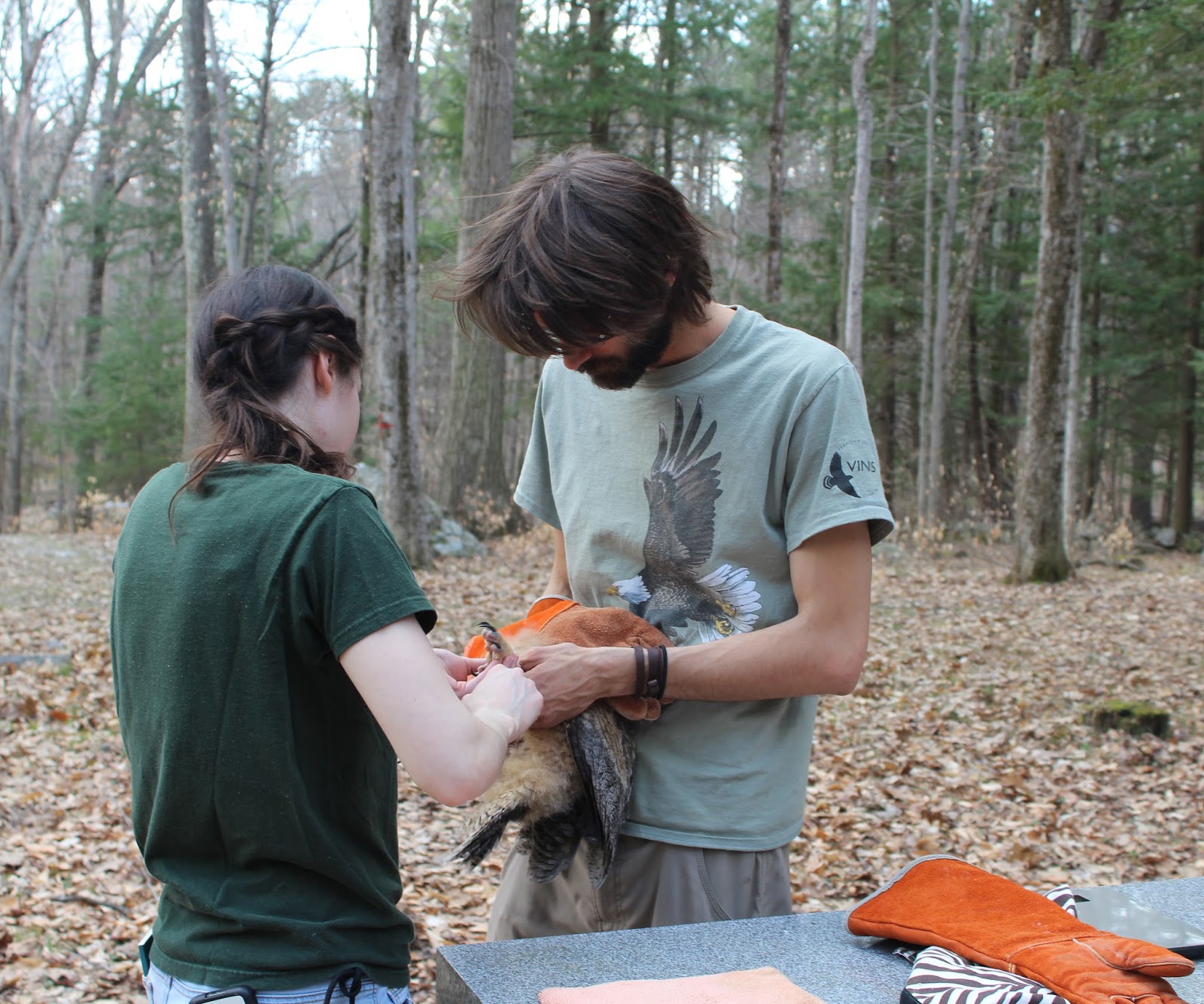 While Peter and I wrestled the ladder into place on top of the stone wall, Grae filled the laundry basket with leaves and a carefully woven network of sticks—much more work than any Great-horned Owl would put into its own nest. During this construction process, Dick and Ann, the two who found the owlet, showed up with a few friends and family members, ready to share the enthusiasm and even some of the labor. They were delighted to hear how we found the second owlet and took some photos of our work.