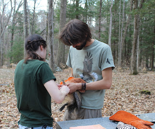 Without even using the net, Grae managed to safely grab the owlet and ferry him down the ladder, all the while being gentle with his newly growing feathers and covering his big yellow eyes to keep him calm. Now it was time for the exams.