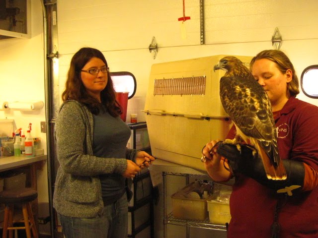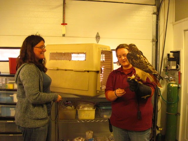 One of the ways VINS motivates people to care about the environment is through research. Recently, Tufts grad student Jana Thomas came to VINS’ Wildlife Services Department to record data on raptors for her Master’s thesis. Below, she summarizes her project. In the photos, VINS intern Katie Christman (right) assists Thomas in handling our red-tailed hawks.