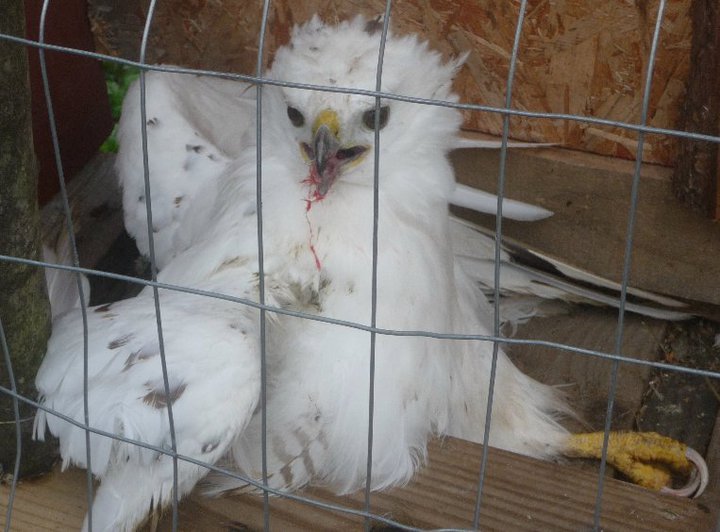 Hawks often work their way into chicken coops with great determination encouraged by a hungry belly. But getting back out of the coop is often tricky for them. Fortunately, the fellow who found this bird was able to release the hawk out of the coop (now shy one chicken), and she flew away.
