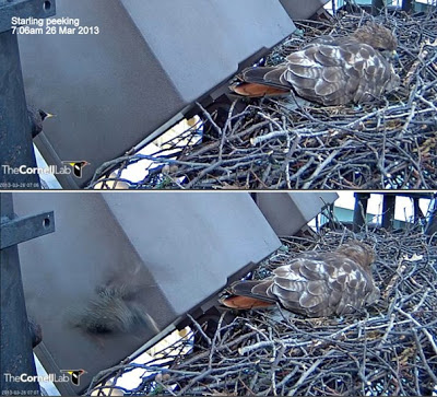 | A European Starling (far left) inches from a Red-tailed Hawk nest.