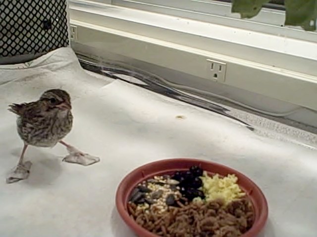 Alas, a young song sparrow in our care needed some corrective footwear to prevent his feet from curling inwards. We believe the bird has a genetic growth deformity where his feet and toes are bending in, preventing him from perching. Perching is essential to a songbird’s survival in the wild — they must be able to wrap their toes around tree branches where they live and fly to to escape predators. Sometimes they use their toes to hold seeds while they peck the seeds apart with their beak.