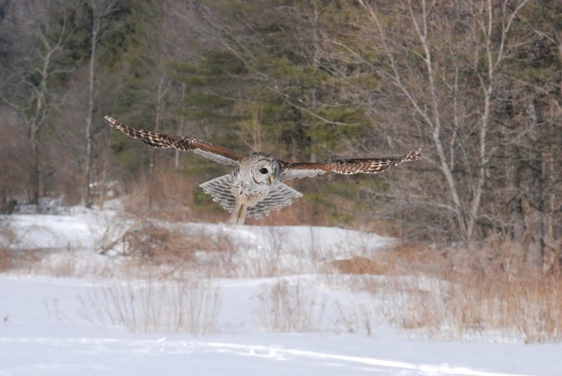 This particular barred owl stood out among our patients. With a shattered bone in his wing and severe head trauma, his prognosis was not good. Yet after keeping his wing stabilized for several weeks, it healed and the owl was ready to fly again. We put him in our large flight cage and to our delight, he flew like a dream! Not only did he get good lift and distance, but he was agile, able to effortlessly switch direction mid-flight. Furthermore, he was a good eater, making him an exemplary patient. Every afternoon around 3:30 we went out and put food on his feeding stump. He wasn’t shy; before we turned to leave, he swooped down and snatched the food without hesitation!