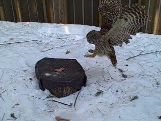 In the video of this owl at feeding time, this owl demonstrates his excellent flying skills as well as an adaptation most owls have: silent flight. Its soft, broad wings and fringed feathers allow it to fly without making a sound. Silent flight allows owls to not only hunt without being heard, but to continue listening for prey as they are flying. Pay attention, all you barred owls: this, ladies and gentlemen, is how it’s done.