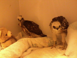 These are the two young, fuzzy white faced broad-winged hawks who came into the care of the VINS wildlife services team last month. The two were rescued by a logger who, unknowingly, was also their downfall when he cut the tree in which their nest was perched. Below is the pair when they first came in.