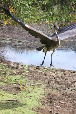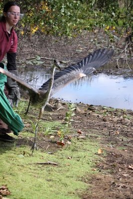 A great blue heron, pictured above, was released recently by the VINS Wildlife Services department. The heron was transported to VINS August 7 when a member of the public saw the bird looking weak. Indeed, after examination, the heron was found to be emaciated and lethargic. Read more about this bird’s stay in our rehabilitation department and see a video of her eating. The photos above capture her release from our care back into the wilds of Vermont. In the top two photos, VINS staff member Kristen Rzemien lets go of the heron. Photos by Brian Bowen.