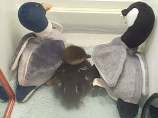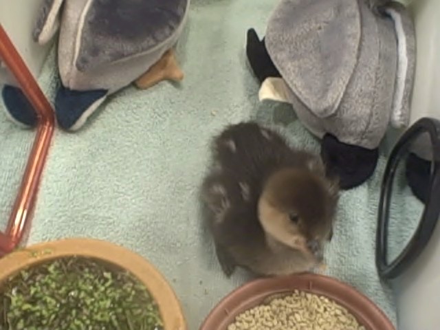 The tiniest waterfowl patient we currently have is an orphaned common merganser, pictured, who was found along the road in Windsor, VT. The person who found the baby was unable to locate its parents, so the VINS rehabilitation staff is going to raise the baby here on site, releasing him when he’s fully feathered and ready to fend for himself.