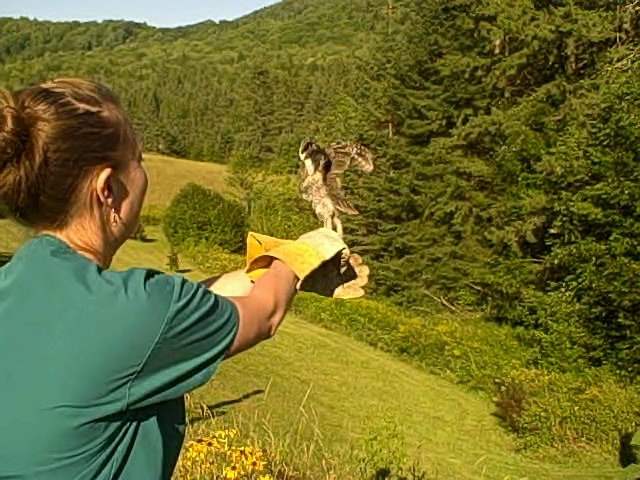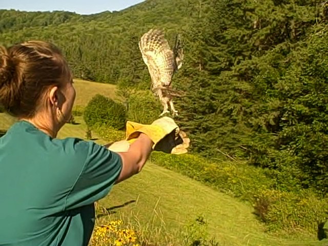 Well, our foster mom is back on exhibit, and our youngster grew up and is on his own in the great wide woods of Vermont. It was a win-win-win for all: the baby grew up with a real owl as his role model; the adult screech had the opportunity to be a mom; and we had the joy of seeing a young bird grow up healthy and return to his home in the wild. See a video of this owl’s release, and take a peek below of some shots of the owl’s first flight into the wild. Click on images for a better view.